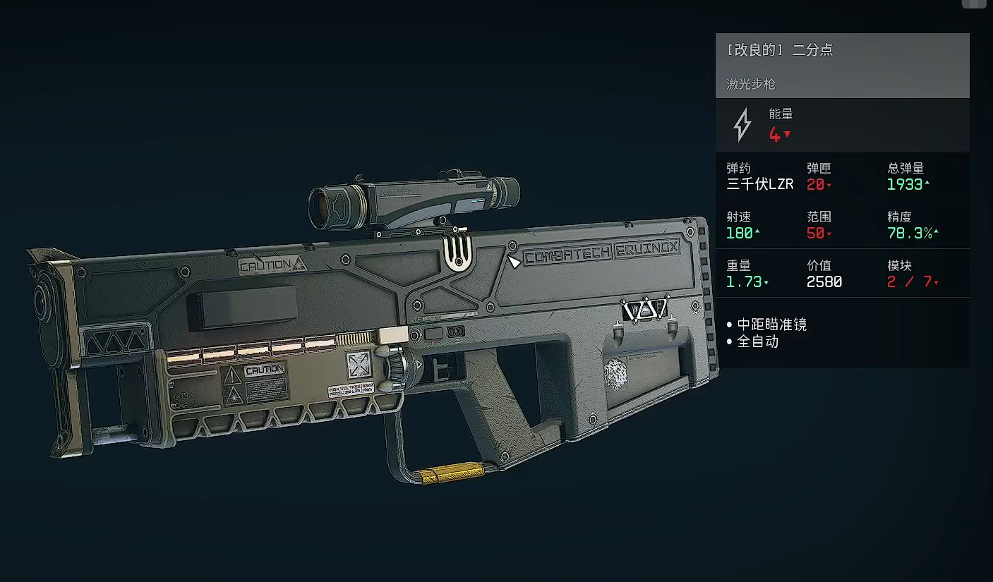 [改良的]二分点:该枪械算是二分点的升级版,它除了单发伤害略有下降,在包括弹匣容量,总弹量和范围在内的这些其他属性上都与普通的二分点相仿,并且其射速和精度都得到了显著提升,这意味着它有了更高的爆发和更稳定的伤害表现,不过对应的,它在重量上的略微提升,也宣示着其牺牲了部分机动性,但好在这个幅度提升的并不算大,所以仍然在接受范围之内。