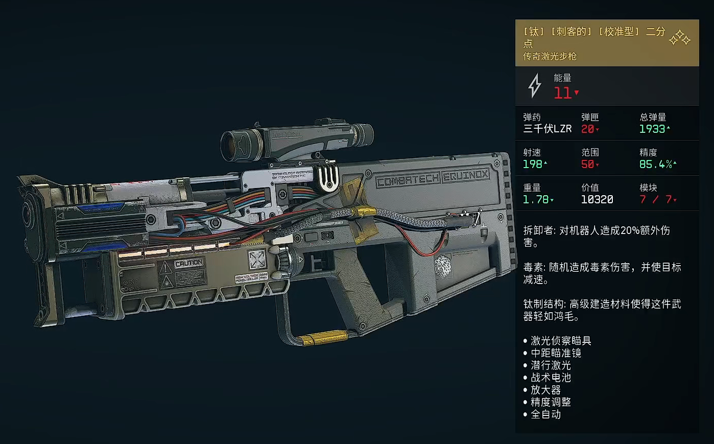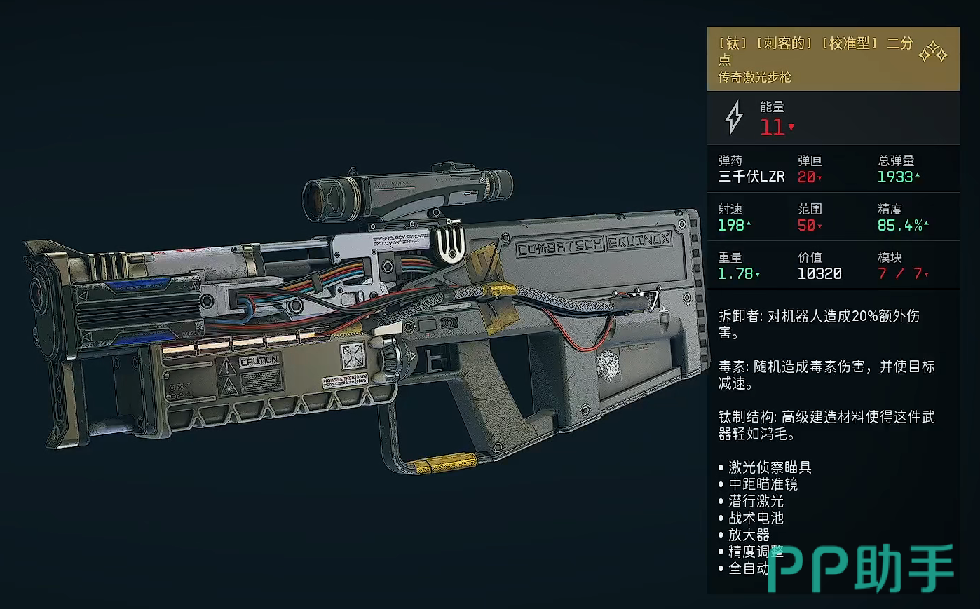 [钛][刺客的][校准型]二分点:它相较于之前提到的两把二分点,在射速和精度层面进一步加强,并且对机器人附带额外20%增伤,同时还有几率造成毒素伤害,再者就是它还有着优秀的钛制结构,这一结构使得它即便装上了多种道具也仍然能够保持一个较轻的重量,以此得来更强的机动性表现。