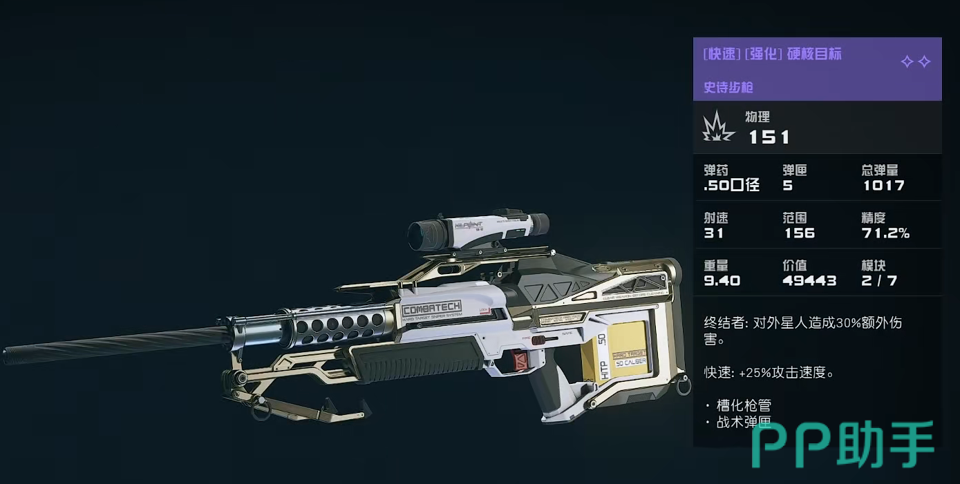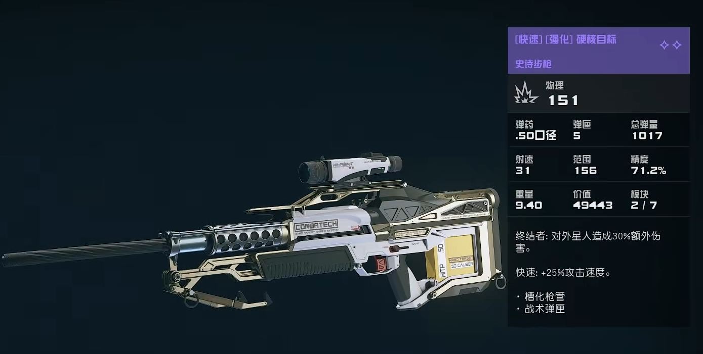 [快速][强化]硬核目标:该枪械算是一把远距离单点式的高爆发枪械,其一发的伤害高达151。并且超大的50口径也为其带来了更强的穿透能力,当然,其5的弹匣容量还是偏低,不过考虑到1017的总弹量和并不算长的换弹时间,因此这个数量还是勉强够用的,然后156的范围和71.2%的精度在步枪中也堪称一绝,至于9.40的重量确实是个弱点,但这些都可以通过它高额的伤害与射速进行弥补。