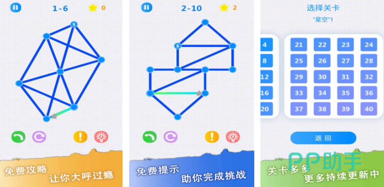 应该有很多玩家都玩过一笔画游戏,这个游戏就是看似简单,但其实操作起来非常考验脑力,因为在游戏中会给出玩家几个目标点,需要只用一笔就把所有的目标点连接起来,不能出现重复和遗漏的状况,因为游戏采用的是关卡制度,所以开始游戏之后会从易到难逐渐提升游戏的难度,这也可以让玩家有一定的缓冲时间。