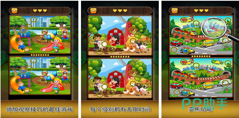 在有限的时间下,玩家需要专注的找出游戏关卡中两张照片的不符之处,同时随着玩家闯过的关卡越多难度会随之增大,此时玩家就可以借助放大镜的道具让你一路畅通无阻,体验超多精美图片,带来视觉享受的同时还能锻炼到注意力和观察力。