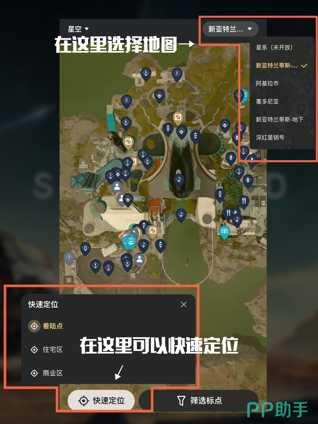 同时用起来也十分方便,右上角可直接筛选其中的一些主要城市和地区,从而帮助你快速进行着陆,左下角还可以快速定位着陆点,住宅区和商业区,进一步方便各位对于外星球的探索。