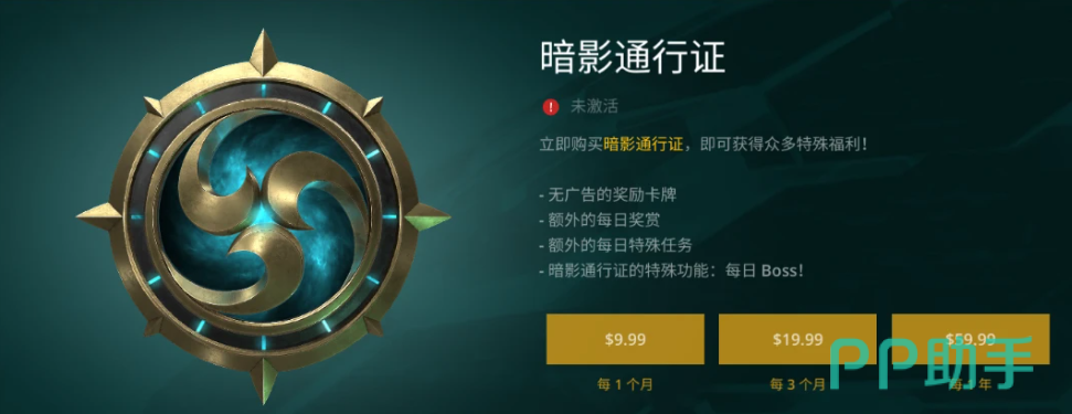 暗影通行证本质上说是一种付费的订阅服务,玩家可以在游戏内的商店中购买。购买暗影通行证后,玩家可以享受跳过广告的卡牌奖励服务、每日任务的额外奖励机制、新增特殊任务数量,除此之外还有个额外的功能,就是能够挑战每日暗影boss,回报十分不错。