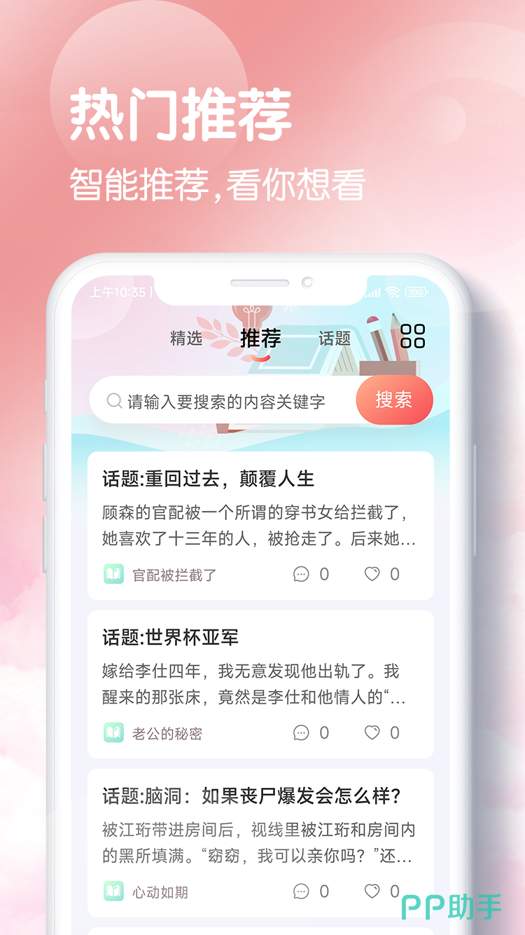 作为文艺轻阅读软件,它分为推荐、精选、话题等分类,线上推荐不同作品,主题风格从悬疑推理到言情甜宠、惊悚到末日灾难等应有尽有,大家私人化推荐小说。