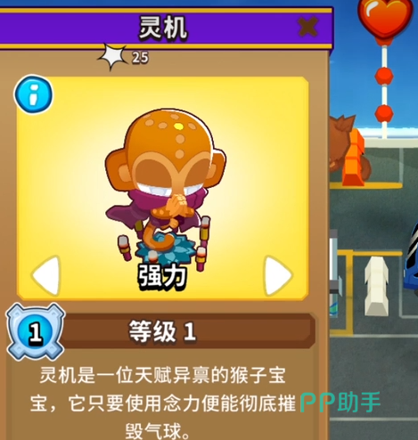 灵机其实既不是道具,也不是技能,它是一种类型的猴子。它的背景介绍是灵机是一位天赋异禀的猴子宝宝,它主要的输出方式便是使用念力进行攻击,它可以使气球本身发生震荡,在震荡过后便可以打破气球,但是相比于普通攻击,这种攻击对于打破气球是更加有效。