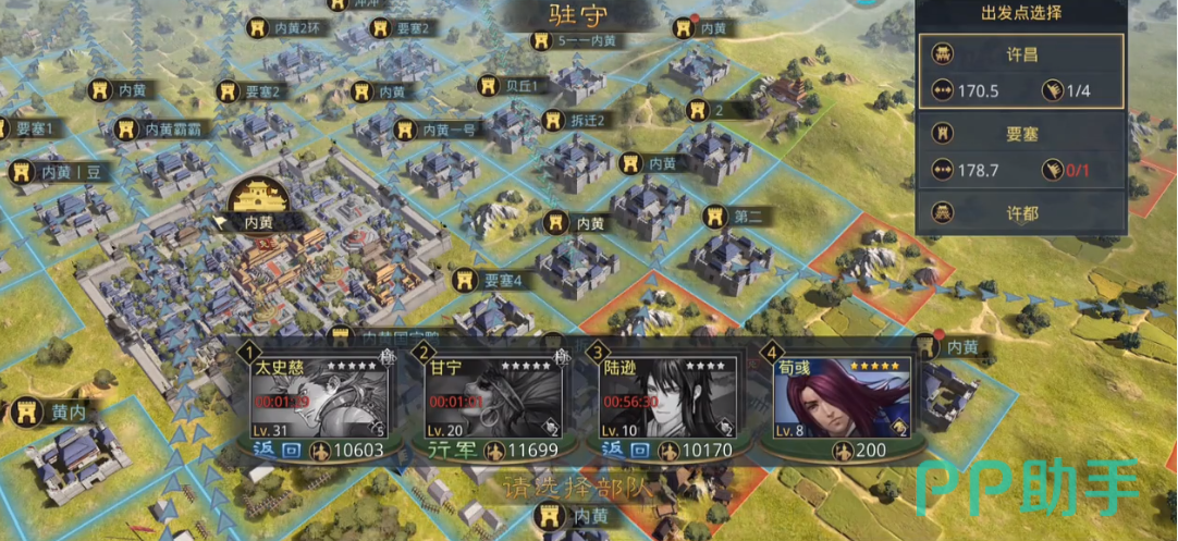在其他的装备上面大家也要有所准备,比如说攻城车以及投石车等等可以帮助大家加快攻城进度的东西都要带上,然后点击自己要去进攻的城池就可以驱使大军前进,到了攻城的时候大家可以先使用远程利用投石车等方式削弱城墙的防御。