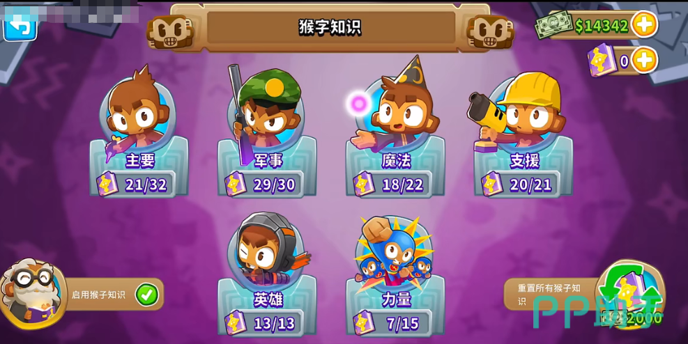 其实对于这款游戏来说,知识是获取了角色以后能够为角色带来的属性点,当然这里的知识不仅是可以为角色增加,还可以为猴子增加,甚至是为道具增加效果,目前大家可以选择到的类型有很多,也就是增加的所有知识类型都不一样,每一种猴子当做炮台被装置在路线当中,能够带来的输出效果也是不一样的。