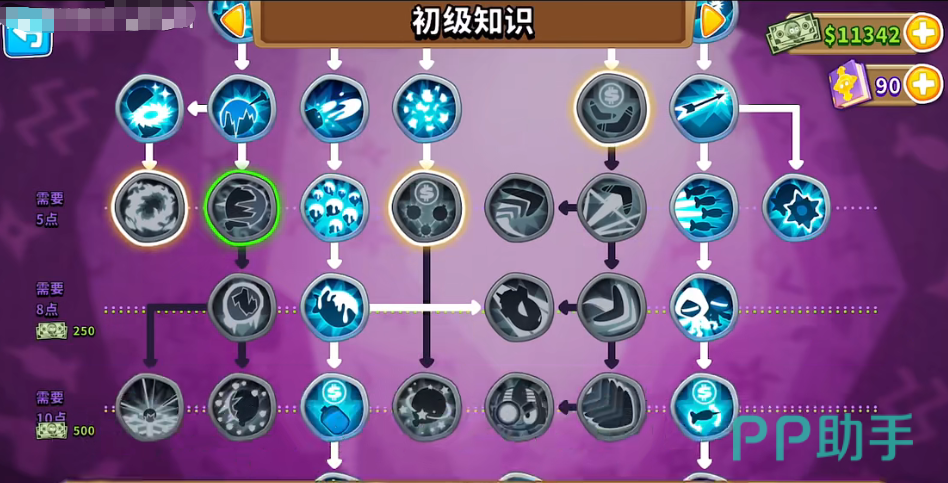 所以大家在后期想要提升这个炮台的效果,那么就在主页面上找到知识的页面,知识这个页面中,大家可以将自己获取的知识点给相应的效果点亮,当然了,在点知识点之前,需要大家先将自己的等级升到40级,这样的话才可以运用基础的九个点数,后期越往后升级,大家才能够拿到更多的知识点,所以说知识点在游戏中也是比较难获取的一个点数。