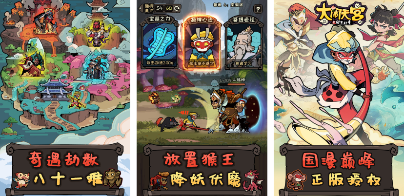 国漫风西游放置游戏,水彩画风与西游题材的结合创造出一个唯美而奇幻的神话世界,玩家们将化身为西行的美猴王,学习各种仙法,苦练降妖之术,经历九九八十一难,进阶蜕变,成为制霸三界的斗战神佛,鬼怪神仙一路结伴前行,自由放置阵法变幻无穷,如意金箍棒在手,一个跟头十万八千里,笑看命中劫数,一路潇洒无羁。
