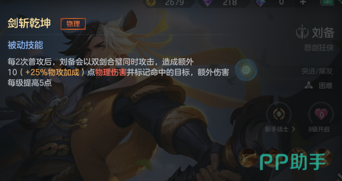 刘备的被动技能剑斩乾坤可以让他在实战中获得更高的输出能力,在对战的时候如果对敌人使用两次平A后,就可以触发双剑合璧的攻击,这个时候就会在原有的基础上对敌人在一次造成伤害并且对敌人进行标记,这个伤害是会随着等级而提高的!