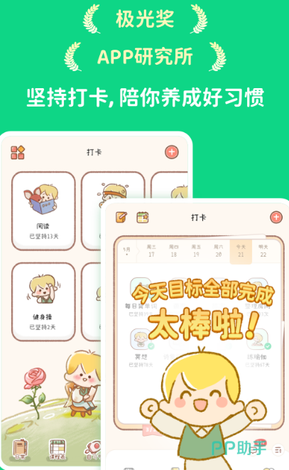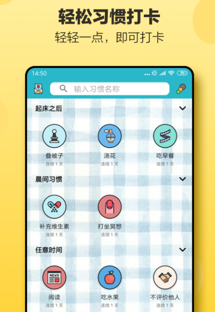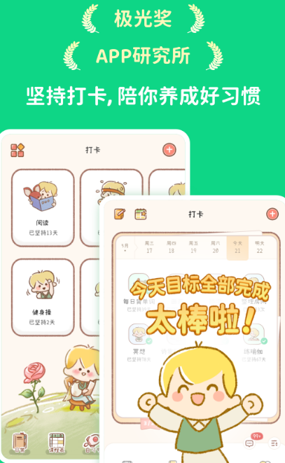该软件虽然在手机上占用的内存空间比较小,但是功能却非常强大,能够让你养成好的习惯,比如在线学习、充实每天的生活,并且该软件还会起到监督的作用,将目标制定到该软件中,每天跟着自己制定的目标来完成,也可约身边的好友一起来打卡、互相监督。
