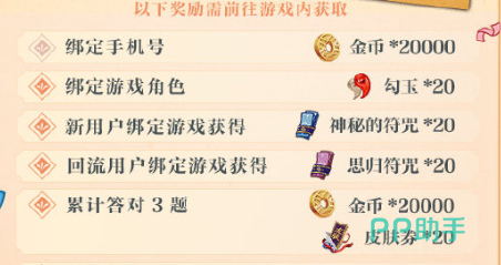 通过协助大家也可以拿到扭蛋币的奖励,只要将全部的10道题都答对,并且有进入游戏签到的玩家还有额外的式神碎片奖励可以领取哦,回归玩家也以后额外的符咒可以收获,如果大家是新玩家直接绑定服务区的话还有额外的神秘符咒道具奖励,每一个奖励都很丰富哦。