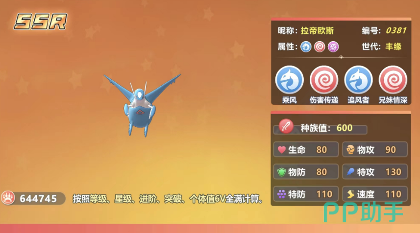拉帝欧斯首先在种族值这块就达到了一骑当千的水平,虽然生命,物攻与物防均没有破百,不过却并不影响它高额的输出表现,毕竟它的技能多半以特攻伤害为主,物攻低基本上没太大影响,而生命和物防虽然只有80,但同样也勉强够用。