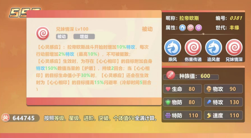 而且该技能还有一个额外效果,那就是只要自己的速度高于目标,那么就可以对其附加额外的10%伤害,而正好拉帝欧斯110的速度特性是碾压大部分敌人的,加上它的培养路线就是以特攻+速度为主流,所以满配后的拉帝欧斯基本上都会有很高的速度属性。