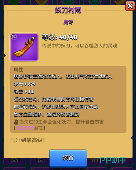 妖刀村雨:这算是目前版本性价比和综合强度都非常高的一把武器,它仅仅四十级的时候就能提供829的固定攻击加成和5%的百分比攻击加成,而且该武器可谓是近战和远程通吃,近身时可以进行大范围的劈砍,而敌人距离较远时则可以直接释放剑气进行攻击。