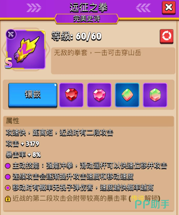 远征之拳:该武器是一把近战武器,虽然它的攻击距离并不算长,不过却有着较高的攻速,所以能够在近身作战时利用这种高频率的攻击来打得敌人措手不及,另外它在近身作战时还可以配合操作来打出二段攻击,这对于喜欢近战操作的玩家来说是非常具有优势的。