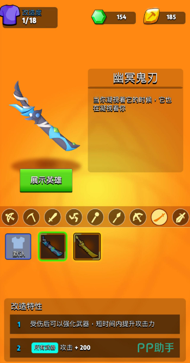 幽冥鬼刀:它作为一把金色武器不仅攻击范围可观,而且基础的面板数值也非常不错,除此之外,通过改造它还能够获得全武器攻击加两百的特性,以及受伤后攻击力提升的特性,两项特性可谓是相得益彰,让本就攻击力高超的角色变得更加生猛。