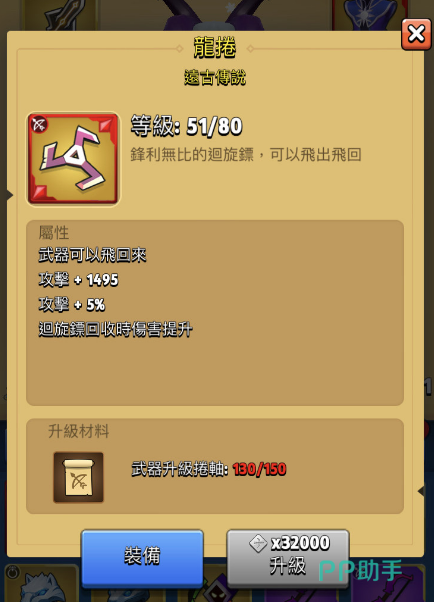 龙卷:这把武器算是一个远程的武器,它的用法和现实中的回旋镖类似,朝敌人掷出后还可以自己飞回来,因此每次攻击相当于都能够造成两段伤害,另外它的属性也算是非常可观,仅仅51级就能提供1495的攻击力和5%的攻击力,这些加成的类型丰富,分别覆盖了固定数值和百分比数值两个层面,可谓是给予了角色全面的提升,另外它还有一个回旋镖收回时伤害提升的被动,这也令它的操作收益进一步提升!