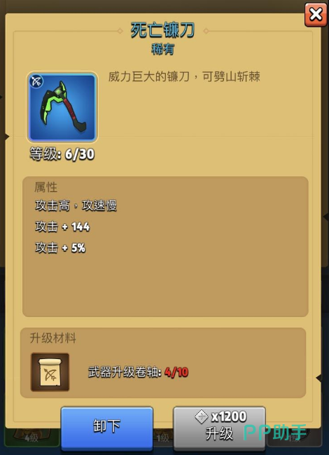 死亡镰刀:该武器是一个近战武器,在前期的时候会比较强势,这主要得益于它较大的攻击范围与较高的攻击力,仅仅六级就能提供144的攻击和5%的攻击,这份高额的攻击加成可以让它在挥砍敌人时表现出非常强势的压制力,不过它的攻速比较慢,所以一定程度上来说是非常吃培养的,只有当攻击数值上去之后这份攻速上的劣势才能被逐渐抵消。