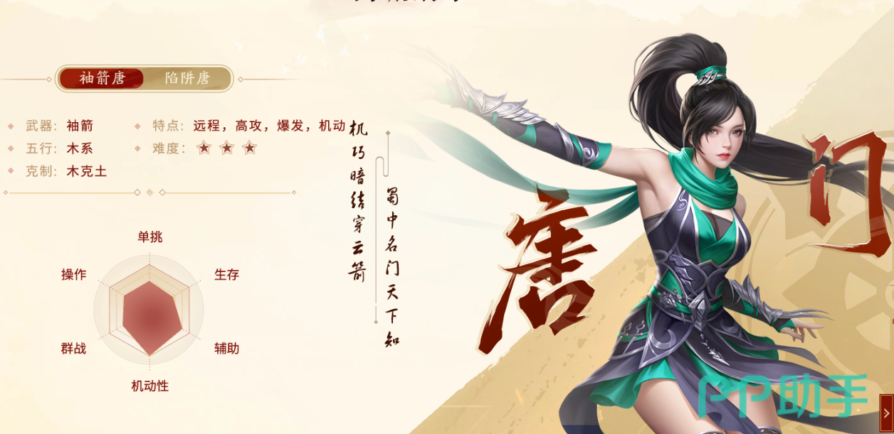 唐门在剑侠世界起源中有两个分支,分别是袖箭唐门和陷阱唐门。袖箭唐门是一个远程输出职业,主属性为力量,擅长单体爆发和追踪敌人,群战时可以利用控制技能保证自身安全。陷阱唐门是一个近战爆发职业,主属性为敏捷,擅长机动和布置陷阱,需要较高的操作技巧和战术意识。