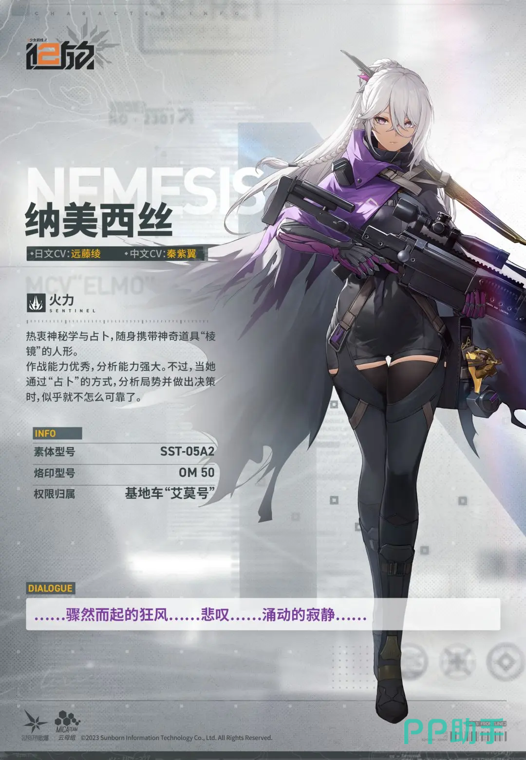 该名角色是一个尖兵型的人形,移动能力方面比较优秀,十分的灵活机动,不仅仅能够对对手造成无视掩体的近身战斗的伤害,而且她还拥有燃烧异位的属性技能,所以能够对拥有燃烧异位弱点的对手进行非常完美的克制。比如说粉碎回旋的主动,除了无视掩体之外,如果击杀对手的话,还能够再次获得移动的能力;淬火斩的主动除了能够造成燃烧损伤之外,还能够给对手添加益火的效果,基本上主动都有移动的效果,在被动方面还能够对暴击进行增益。