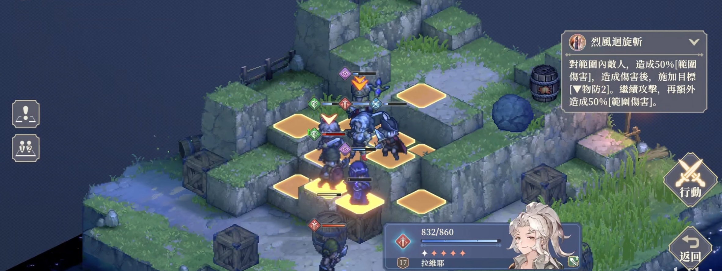 在第一回合的时候,由伊南娜和拉维耶出战,玩家要先把伊南娜放置到黯心的前面,让她对面前的敌人施展魔法攻击,接着让拉维耶进行攻击,先用【烈风突入】对敌人施展重击,接着依靠【狂热重击】来收割对面敌人的生命,并为自己回一点血,这一套连击招式真的十分飒爽。