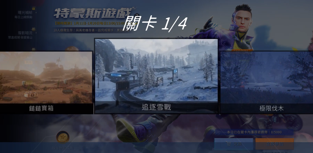 特蒙斯游戏是属于一个限时挑战的副本,这个副本当中参与的人全部都是玩家,10名玩家会通过匹配进行同一个地图,在地图选择中是有6个类别可以选择的,有速度之间的竞技生死竞速模式,还有趣味十足的追逐宝箱模式,喜欢雪地地图的可以选择追逐血战模式。