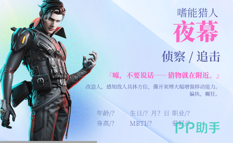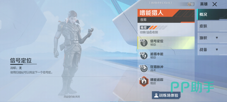 首先在定位方面他是侦察型的角色,比较擅长的方面就是对对手进行追击,然后完成最后的收割,完美收尾。接下来就看看他的技能是什么样的,他在被动上就有两个,一个是信号定位,能够通过扫描的方式将下一个信号区给找出来,有点像维德的被动了,没有冷却的。