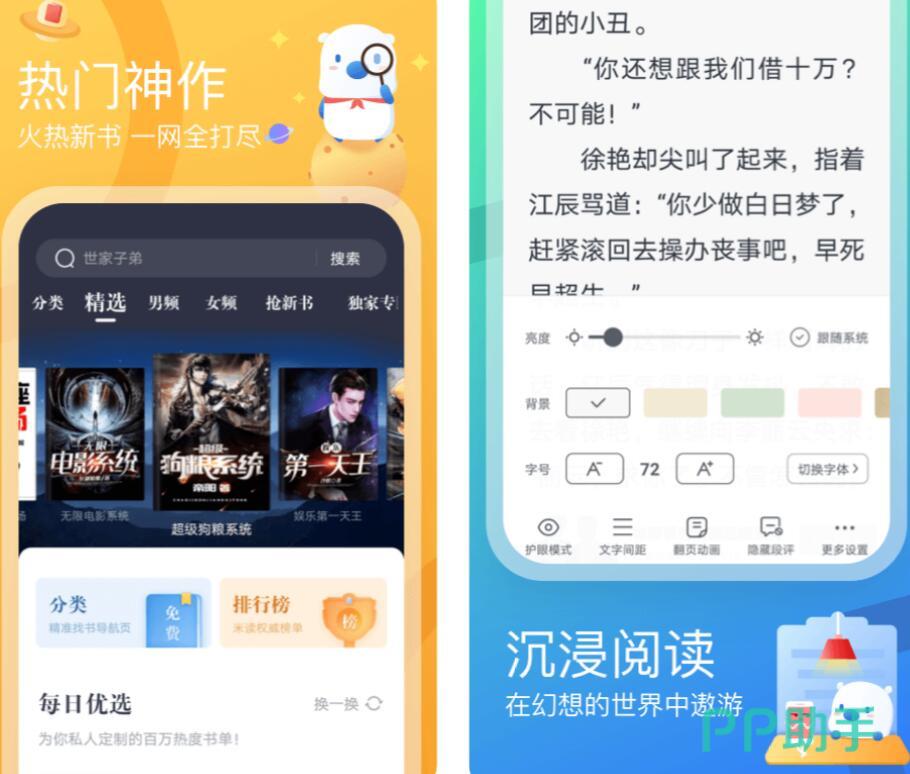 在软件的首页,平台设置了两个版块,一个是分类区域,另一个是排行榜,当你陷入书荒的时候,可以在里面找找,说不定有你爱看的佳作。用户在阅读时,可以自定义许多参数,比如调节亮度、更改字体的大侠,以及背景的颜色,调整到适合自己的状态,阅读时会更加舒服。