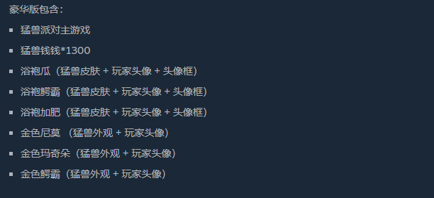 而豪华版的定价比普通版的定价只要多个大约49元钱,即豪华版大概要147元,而普通版只需要98元,这贵的49元就是上述的皮肤还有猛兽钱钱等道具,如果喜欢以上外观的话可以购买豪华版。
