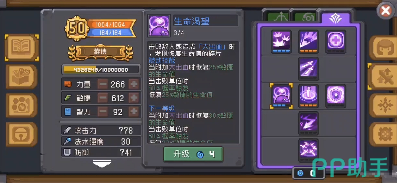 最后来看看二系技能游侠,保持距离点满,可以增加游侠伤害,打单个boss时特别好用。爆裂也点满,它附带的大出血效果十分bug,并且在击杀一个敌人后还能有后续伤害。打多个敌人时简直不要太好用。最后的疾风骤雨也直接点满,可以直接增加游侠的普攻能力,直接对敌人进行多次攻击。