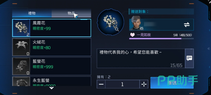 快速提升亲密度的方法当然就是赠送游戏中的一些礼物了,在好友聊天框右上角点击礼物图标样式打开赠送界面,这里可以看到礼物对应的亲密度提升值。比如赠送凤霞花可以增加99点亲密度,赠送蓝萤花更是可以直接增加999点亲密度。这些礼物我们可以通过参加游戏中的活动或者是直接在商城购买获取。另外这个地方还可以给好友赠送一些材料,但是材料是没有办法增加亲密度的哦。