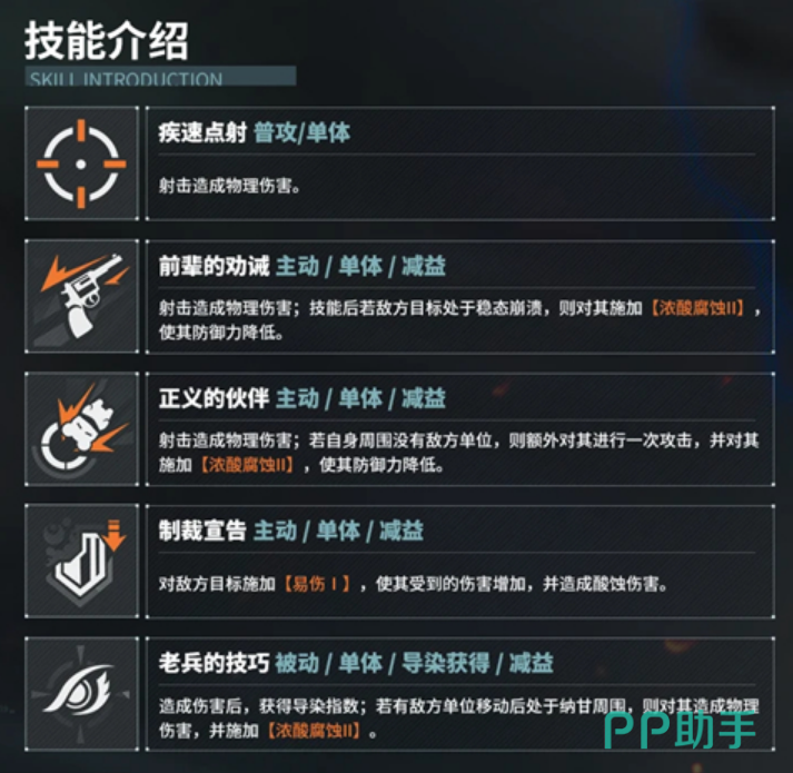 纳甘的技能有以下几个特点:她的主动技能可以在一定范围内对敌人造成伤害,并且降低敌人的防御和移动速度,持续一段时间。这样可以让我方的火力和爆破角色更容易打出高额的伤害,同时也可以减缓敌人的进攻速度。