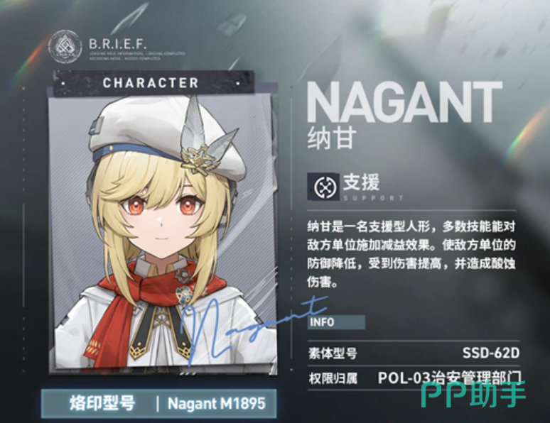除此之外,她的专属武器则是一把纳甘左轮手枪,纳甘左轮手枪的特点是可以在每次攻击时增加自身的攻击力,最多可以叠加五次。这样可以让纳甘的输出能力逐渐提升,从而在支援的同时也能为我方贡献一定的火力。