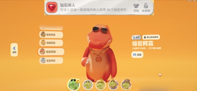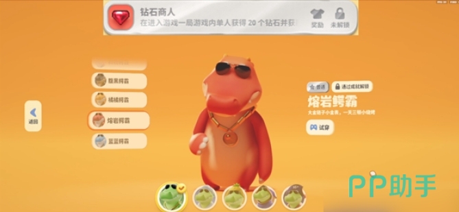 比较简单就可以完成的成就这里还有一个钻石高人,这个成就只要大家在一场对局里面累积获取20个钻石的话就可以拿到,当然也需要这场对局大家最后的结果是胜利方哦,完成成就之后大家就可以拿到熔岩鳄霸皮肤。