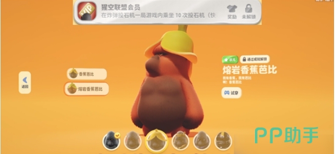 猩空联盟会员和这个成就是需要大家去参与有投石机的地图,在里面玩家是操作动物去乘坐投石机的,所以这里是需要大家一场对局中累积坐到10次投石机就了可以拿到香蕉芭比和这个成就。