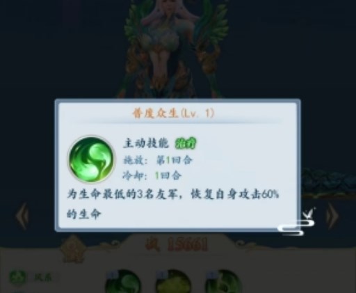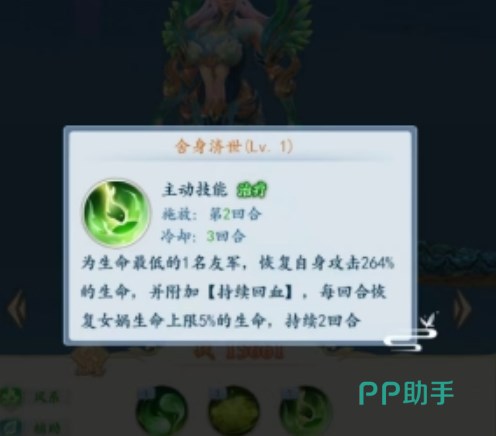 此外女娲还有一个比较特殊的主动技能“舍身济世”,给血量最低友军治疗,同时为其增添一个存在2回合持续回血效果,第一次回血效果与女娲攻击挂钩,持续回血效果与女娲生命值挂钩。有了这两个主动技能,女娲的保人能力便有了保障。