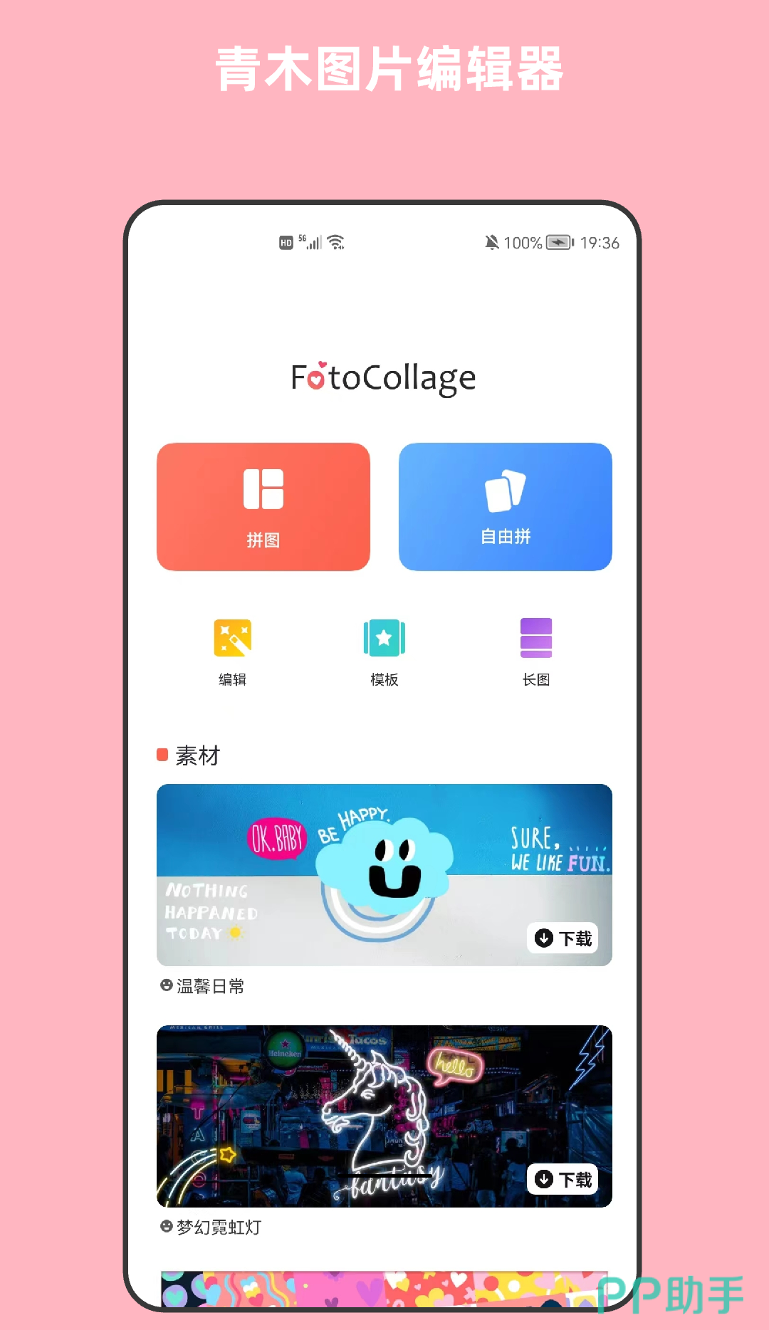 可以把多张照片拼成一张照片的APP,每次最多可以选取20张照片,可以利用软件当中的模板进行拼图,也可以根据自己的需求来自由拼,100多种背景和贴纸都可以应用到你的拼图上面。