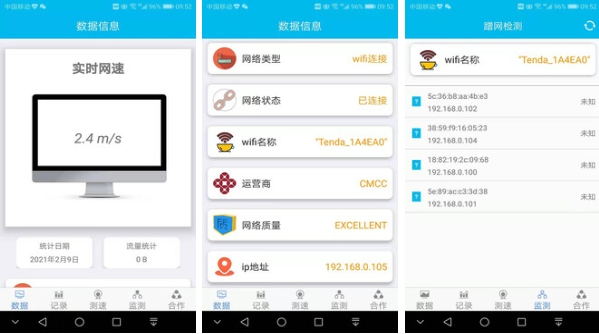 在功能上可以进行有效的实时网速的检测。用户想要知道当下的网络环境情况可以通过当下的数据信息来了解。在信息的内容中包含了网络类型和wifi名称,ip地址和对使用者当下的网络质量进行评价。如果觉得网络卡顿时可以进行网络检测并了解当下连接这个网络的设备和ip使用情况。
