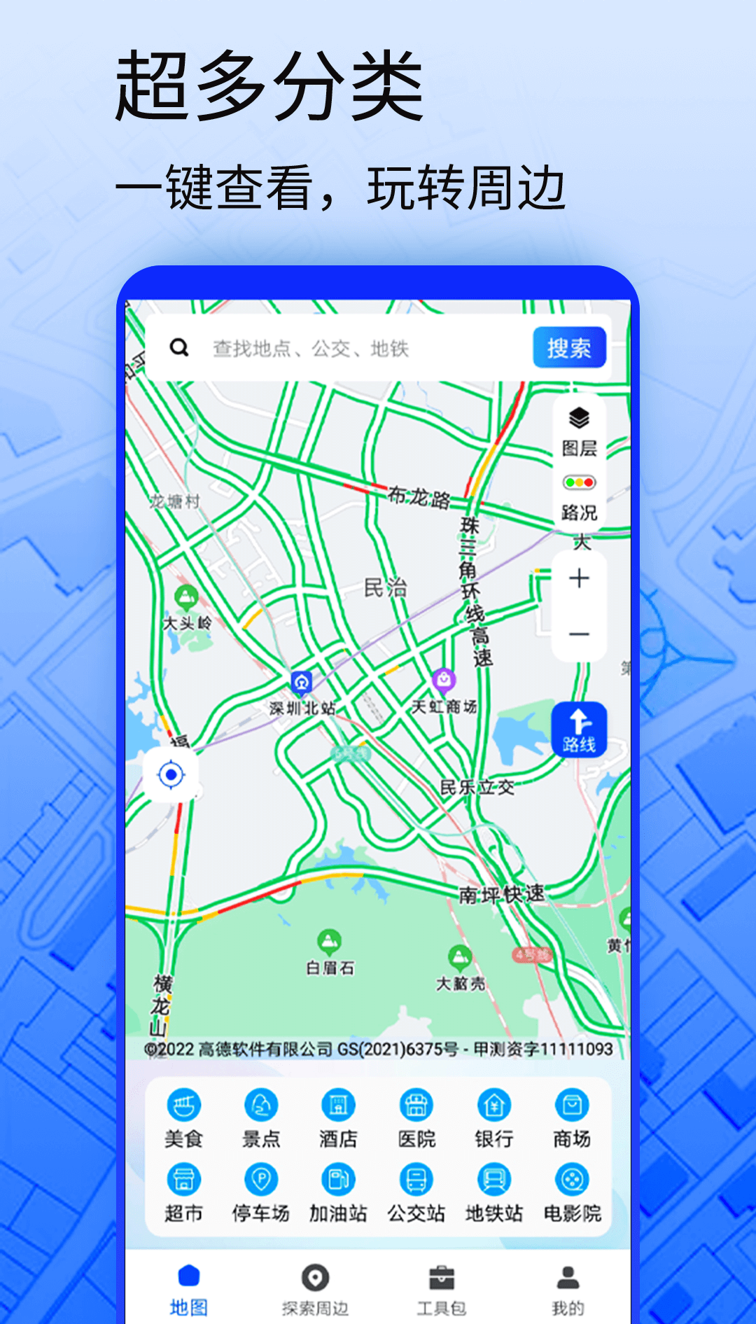 一天就可以查看周边可以吃喝玩乐的地方,快速搜索就能够精准的定位,帮助大家找到合理的出行方案和计划,可以选择驾车、打车、汽车、步行等等的出行方式,可以测距、测面积、测海拔等等。