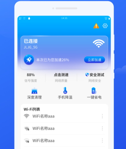 该软件最大的优势就是拥有很多的功能,不仅可轻松的帮你破解无线的密码,并且还可帮你进行密码的管理,这款软件最大的优势就是操作比较简单,虽然功能很强大,但是只需要简单的几步骤就能进行操作,还可进行垃圾清理,不会使手机出现卡顿,快速的来提升网速,如果在连接WiFi时遇到了不安全的网络,也会第一时间发出提示,不会让自己的手机受到影响,是非常贴心的一款软件。