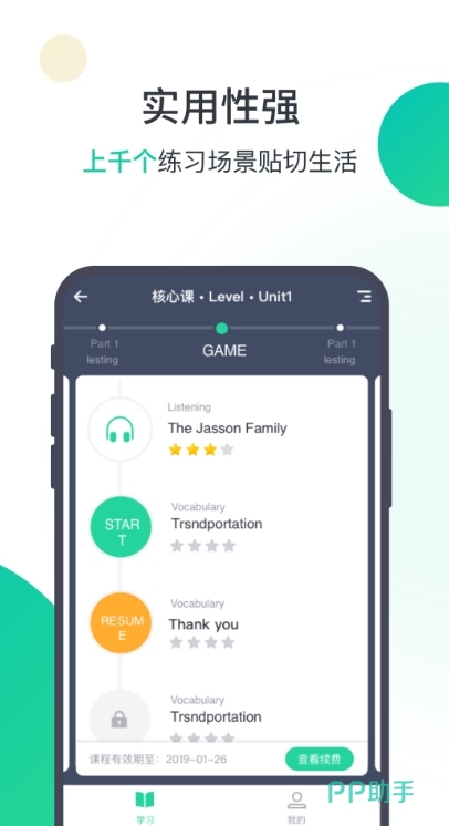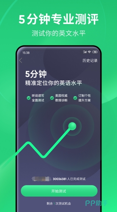 这是一款非常有趣的学英语平台,没接触过英语的小伙伴也不用过于担心,里面有一个单独的测试,可以测试出英语水平有多少,进一步的规划英语学习的语法,纠正发音。
