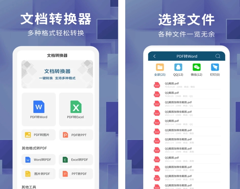 多种文档格式轻松转换, PDF、 JPG图片以及PPT文件都可以转化成文档文件,用户只需在线上传对应的文件即可一键转换。同时软件支持聊天软件导入,各种文件一览无余。