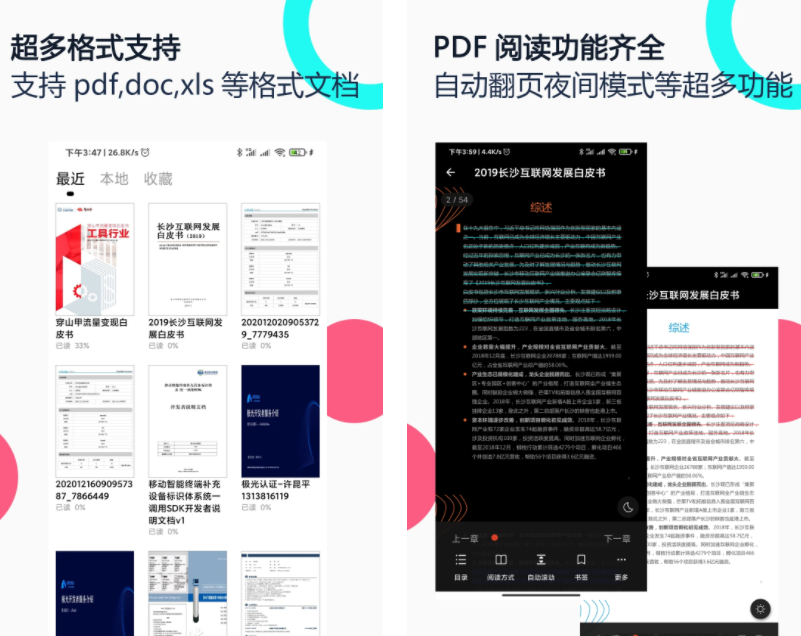 支持超多格式, xls、doc、PDF等文档都能打开,而且在阅读上有自动翻页以及夜间护眼模式等操纵功能。文件可以在线进行编辑,画线高亮、画笔标注都可以,整理好的文件,通过强大格式转化功能不限次数与其他文件格式互换。