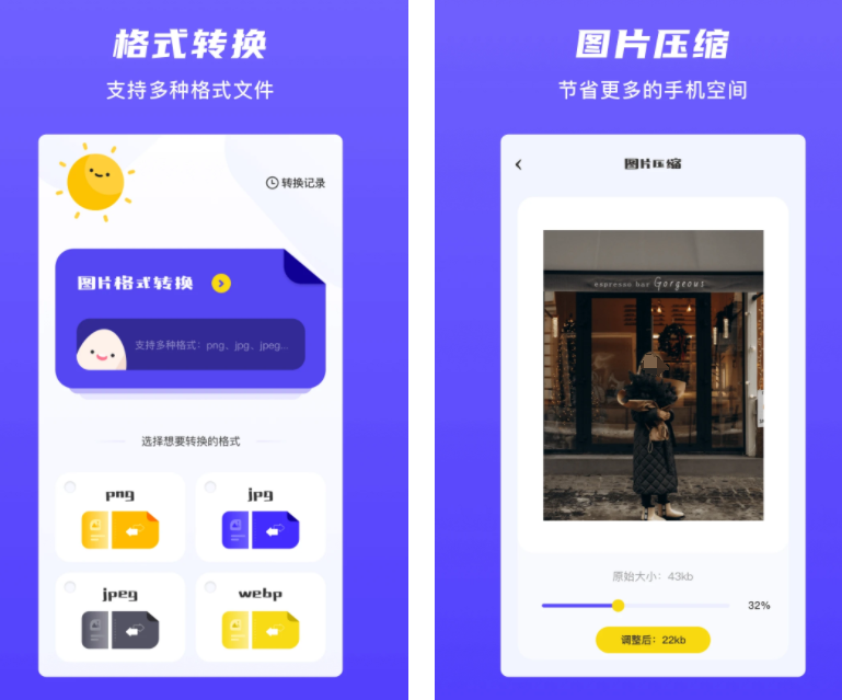 这款软件使用方法较为简易,支持主流的PNG、JPG、 Webp等图片格式,可以在不同格式之间自由切换,进行图片质量压缩,自定义长宽比,修改过大的图片尺寸,帮你节省更多的手机空间。