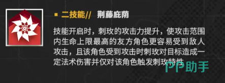 除了能够提高攻击,荆藤庇荫还可以强化攻击范围内的队友,只要范围内某一名队友的生命上限是最高的,那么他就会更容易受到敌人的攻击,而且他被攻击后,刺玫会立刻对供给来源发动反击以及造成法术伤害,同时还能触发特性来回复队友的生命值,考虑到其天赋正好能加强队伍前排的治疗效果,所以两者配合之下,技能的实战意义变得更高。