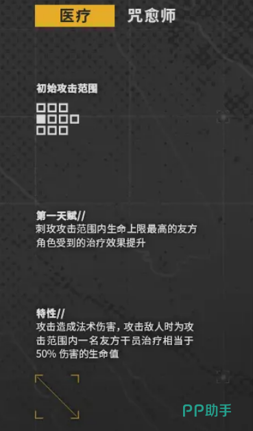 在定位上她是一个主打医疗的咒愈师,初始的攻击范围还算不错,并且通过第一天赋她还能够在自己的攻击范围内,提升生命上限最高队友所受到的治疗效果,换言之只要有她存在,那么前排队友的坦度就会得到进一步的提升。