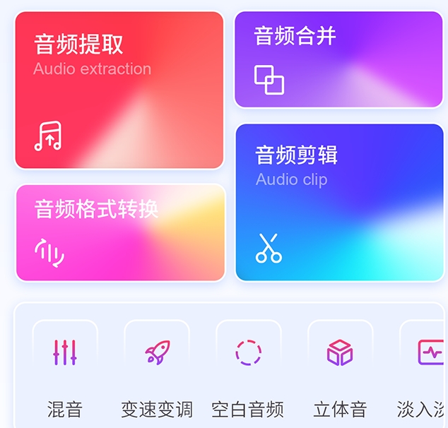 在这里用户能去自由的去进行音乐的裁剪,同时还带来了音乐的合并以及提取,包括音乐的混合给到大家,像文字针对语音的转换,以及视频的伴奏提取等等,格式的转换也是十分简单,还能去进行压缩,让大家的编辑变得更加自由。
