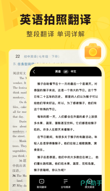 大家可以使用软件中的英文拍照功能,可以进行分句精讲,点击单个生词就可以得到翻译和发音。最好的音标学习方式应该就是朗读文章,而在此软件中可以调节朗读速度,不懂得可以反复听。课本上的英语图文不懂得也可以上传到软件中,就会自动翻译。