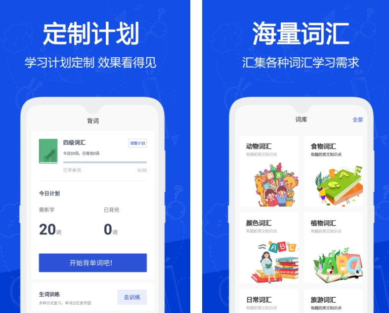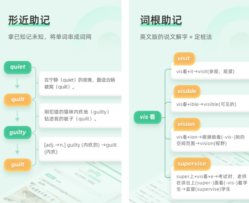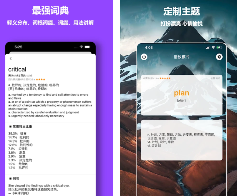回归背语单词的本质,这款软件不设限学习的方式,将重点放在词库质量上,用户跟读学习的自由度很高。软件有高饱和的漂亮色彩配搭,能够帮你从听觉与视觉上加强记忆,降低学习英语过程中的枯燥感。